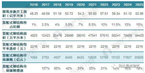 另外,按照政策的普遍要求,未来十年内“装配式建筑将占新建建筑面积30%、装配式钢结构占15%”的比例,预测新增住宅面积每年提高3%,以10年为周期,以现有的装配式建筑平均价格计算,2025年装配式钢结构的市场规模将达到2万亿元。