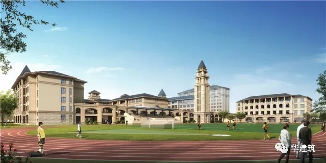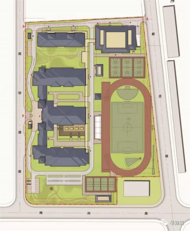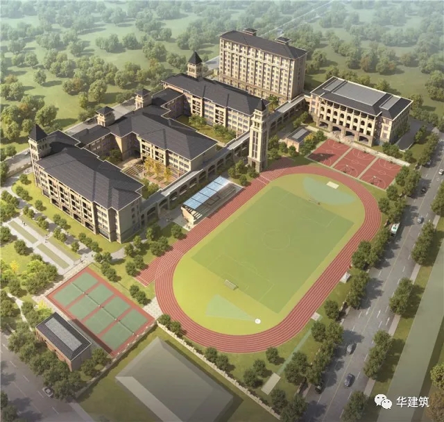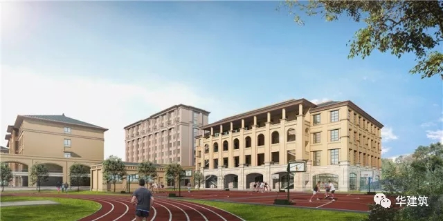教学办公楼以北为学生公寓楼,将学生宿舍集约设为一栋高层公寓楼,节约占地,提高土地利用。多功能综合楼布置在基地东北角,其中包括底层学生餐厅、教工餐厅、厨房、多功能教学用房(兼学生剧场)、健身活动及风雨操场等。地下车库设置在多功能综合楼地下一层;建筑单体之间通过贯穿南北的风雨长廊联接。基地东南角为运动健身区,主要包含300米标准运动场、1个足球场、4个排球场、3个篮球场等,300米标准运动场沿基地东侧边界南北向布局,阻隔东侧城市主干道噪音对教学干扰。