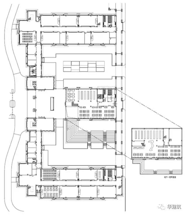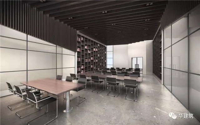 校园图书馆结合下沉知识广场设在公共教学楼底层,以下沉知识广场的公共开放空间为核心,通过底层架空的公共学习区串联两个院落空间,相互渗透与共享,加强了校园内部的整体结构,形成一个多维互动,融合的校园庭院空间。