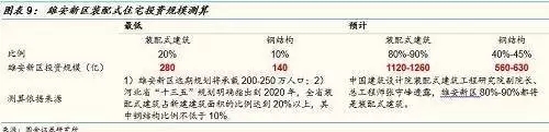 根据相关专家分析,装配式比例采用80%-90%,已估算雄安新区需要7000万平米的住宅面积,则装配式住宅面积将达5600-6300万平方米,按照2000元每平的价格计算,雄安新区住宅装配式的投资规模可达1120-1260亿。若按照40%-45%采用钢结构的比例计算,则钢结构投资规模可达560-630亿。
