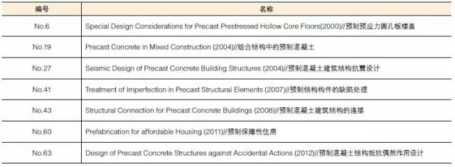 总部位于瑞士的国际结构混凝土协会fib于2012年发布了新版的《模式规范》(MC2010)。模式规范MC90在国际上有非常大的影响,经历20年,汇集了5大洲44个国家和地区的专家的努力,修订完成了MC2010。相较于MC90,MC2010的体系更为完善和系统,反映了混凝土结构材料的最新进展及性能优化设计的新思路,将会起到引领的作用,为今后的混凝土结构规范的修订提供一个模式。MC2010建立了完整的混凝土结构全寿命设计方法,包括结构设计、施工、运行及拆除等阶段。此外,fib还出版了大量的技术报告,为理解模式规范MC2010提供了参考,其中与装配式混凝土结构相关的技术报告见表4,涉及了结构、构件、连接节点等设计的内容。