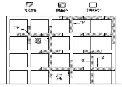 对预制构件进行正确、合理的拆分是装配式结构设计的重要工作,它对建筑立面、结构受力、工程造价等都会产生影响。构件拆分时,预制构件的设计应满足建筑模数协调,预制构件的连接部位尽量设置在构件受力较小的部位,并应尽量减少预制构件的种类,保证模板能够多次重复使用,使预制构件便于生产、运输、堆放、安装及质量控制。图1为某框架结构的拆分示意,预制构件的形式可为一字形、T形、十字形、Г形、├形及竖向树形和水平树形等,框架梁柱节点可为现浇或预制。