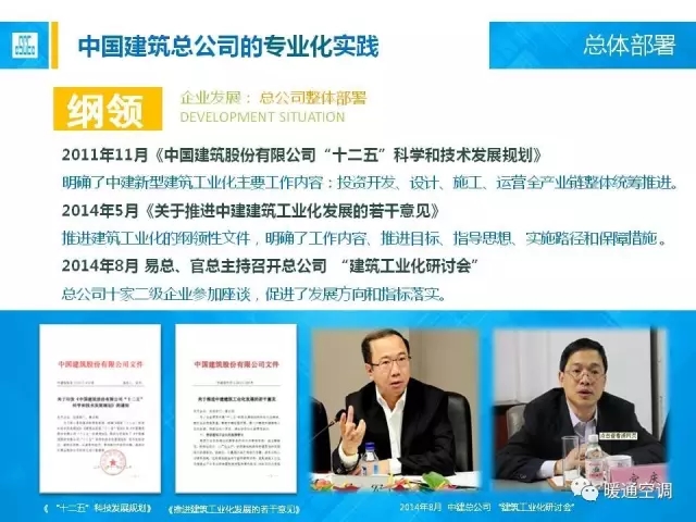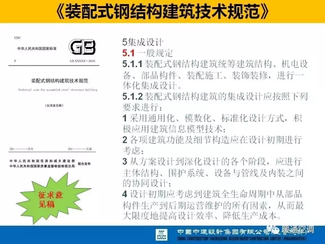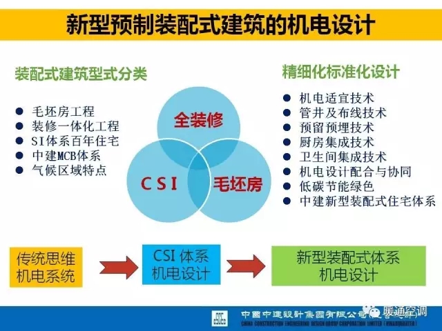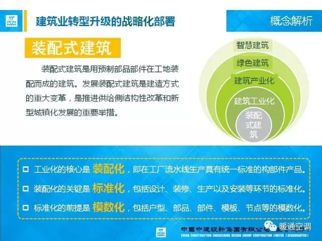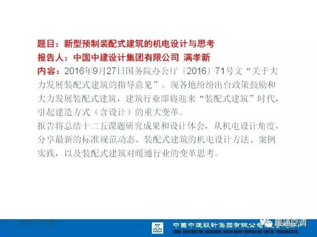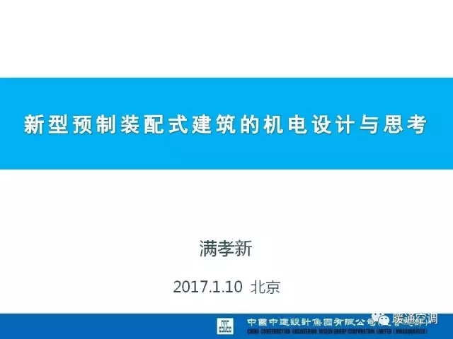 中国中建设计集团有限公司暖通总工程师满孝新先生总结了十二五课题研究成果和设计体会,从机电设计角度,分析最新的标准规范动态、装配式建筑机电设计方法、案例实践以及装配式建筑对暖通行业的变革思考。