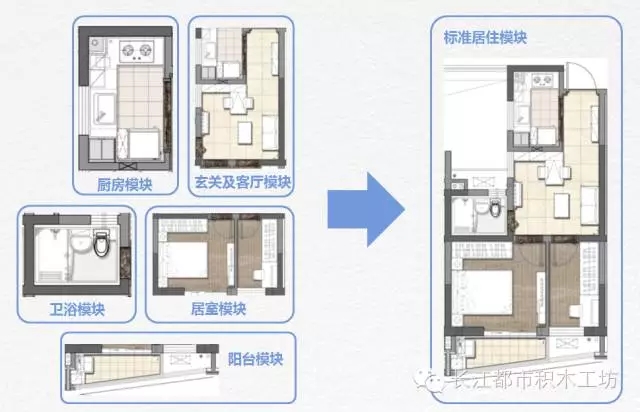 项目采用一个标准户型,一个标准厨房和卫生间,形成符合模数数列的标准化模块,通过标准模块的组合拼接,形成标准户型模块。