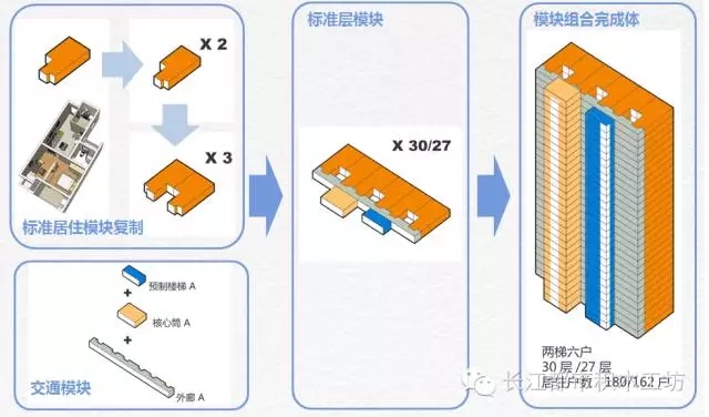 目通过标准户型模块单元与核心筒模块组合形成标准层单元。