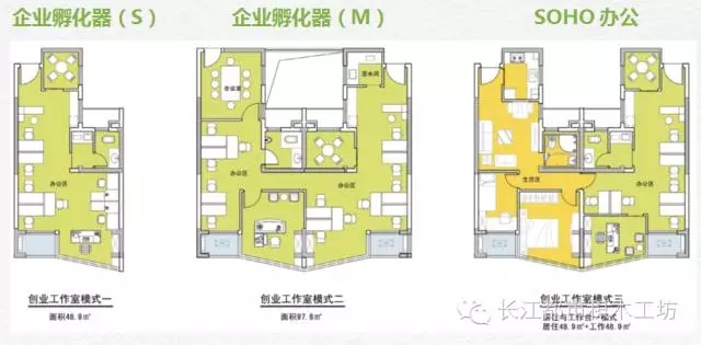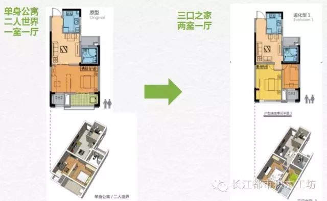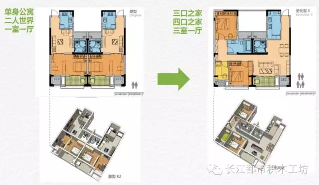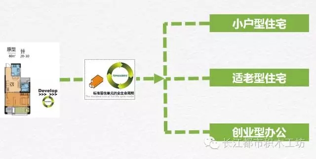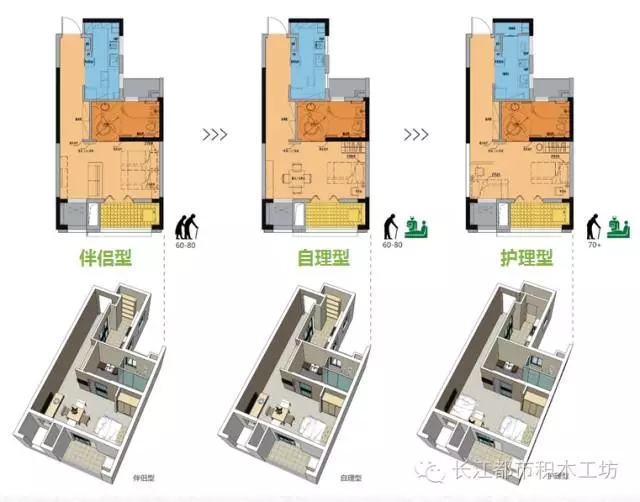 通过标准化、模块化设计,建筑内部空间便于调整尺寸进行多样化组合,形成可持续、可变化、适用于各种不同人群需求的户型。如小户型考虑单元演变为三口之家,双拼形成三代同堂。适老型可以分别满足伴侣型、自理型和护理型。创业型也从孵化型、成长型到SOHO办公都有平面布局的考虑。