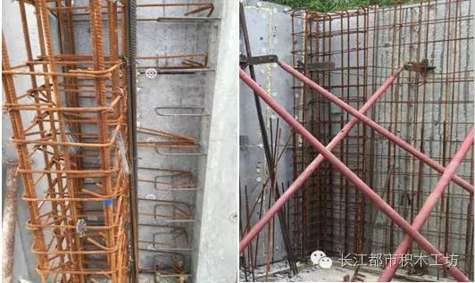 现浇暗柱钢筋绑扎 PCF板就位与斜撑架设