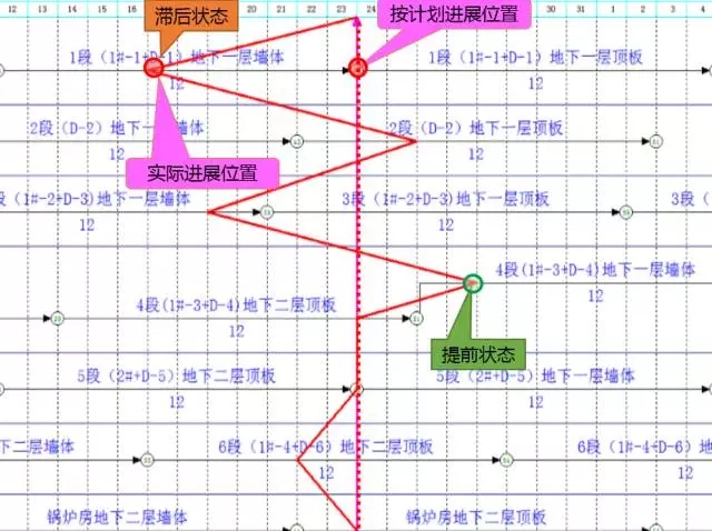 2、在地下结构施工阶段、地上主体结构施工阶段、装修阶段,分别编制阶段里程碑网络计划,按照月绘制前锋线进行实际进度与计划的对比分析,进而进行进度检视和纠偏;