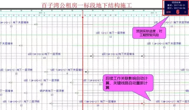 我们每周都对项目实际进度进行了前锋线统计分析,当发现计划偏差时,预测对后续工作的影响,及时组织班组进行合理赶工,并且在组团之间进行了“施工大比武”活动,最终保证了2017.5.31基础阶段顺利完工!