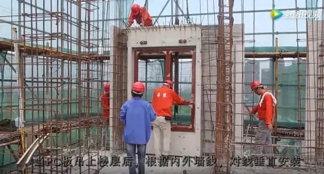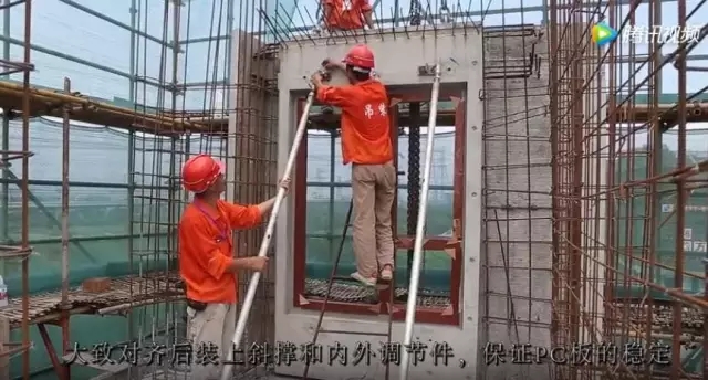 当PC板吊上楼层后,根据内外墙线,对线垂直安装。