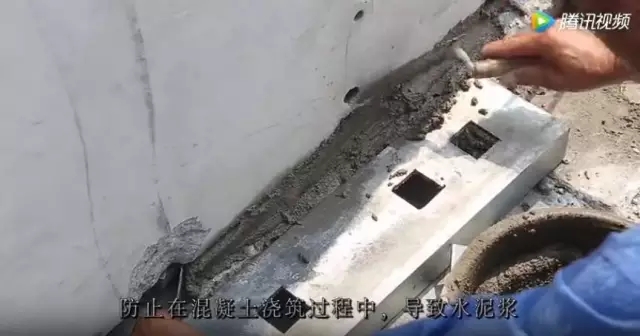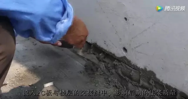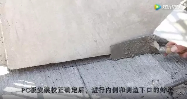 PC板安装校正确定后,进行内侧和侧边下口的封堵,防止在混凝土浇筑过程中,导致水泥浆流入PC板与楼层的交接缝中,影响后期的注浆质量。