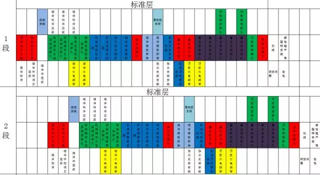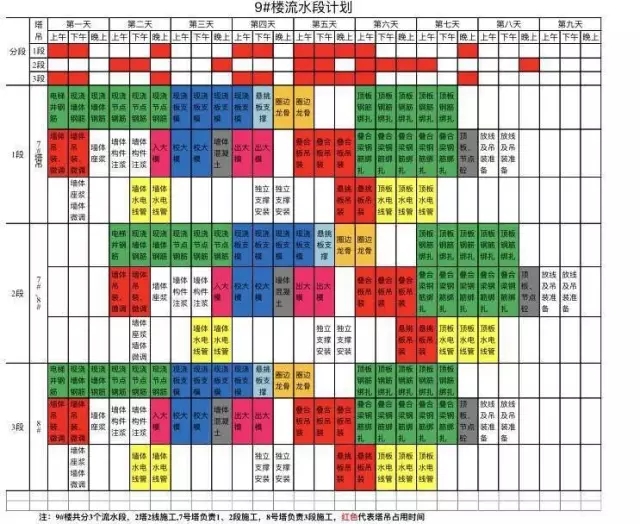 1.前期策划:根据本工程内装工业化湿作业少,部品安装特点,重点策划穿插整体计划,流水计划,材料计划,合同计划。以9号楼为例,共分3个流水段,2塔2线施工,7号塔负责1、2段施工,8号塔负责3段施工,标准层结构施工计划如下表所示,红色代表塔吊占用时(下表前五行是塔吊用时汇总):