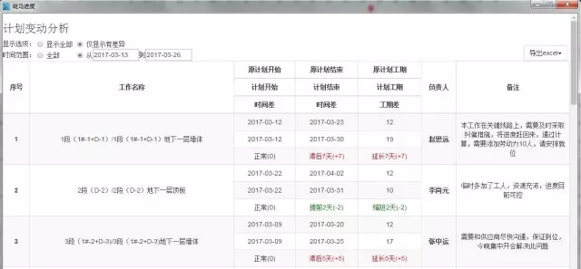 同时,我们运用软件内“进度对比分析”功能,可以及时生成计划报表,将当前的每个工作的实际进度和计划的对比信息输出表格,下发给相关工长,督促其及时采取纠偏措施。