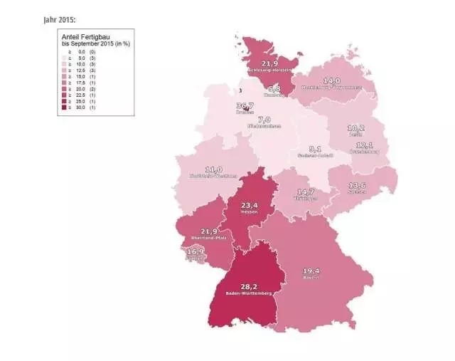 图02 德国各州2015年预制装配式小住宅(独栋和双拼)在新建建筑中所占比例,总体平均达到16%左右