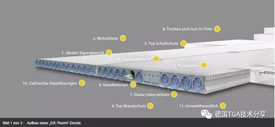 装配式混凝土结构楼板也是预制的,就像本系列第二讲里介绍的那样(德国楼宇技术(TGA)分享 (二,家庭室内冷热),预制楼板内可预埋供暖供冷的管道,或者预埋通风管道,需要符合防火、安全、隔热、减噪等舒适度要求的。