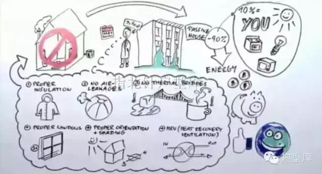 被动式房屋也就是不需要主动加热制冷的房屋,仅依靠屋顶的太阳能,和人在室内正常生活带来的热量,比如人走动散发出来的热量,咖啡辐射出来的热量等。