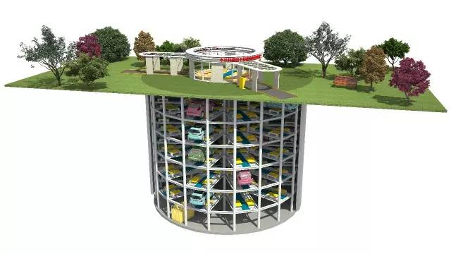 停车时,车辆进入停车门亭,由搬运小车将车辆搬运到沉井中央圆形停车平台上,设备自动旋转向下运输,智能控制定位将车辆停放到地下空余的车位上;取车时,输入车牌号或刷卡,搬运小车将自动行走到相应车位取车,90s左右送达出口处取车室。