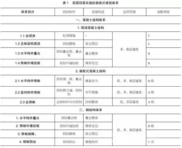 我国目前实施的装配式建筑体系包括混凝土结构体系和钢结构体系两大类,详见表1。