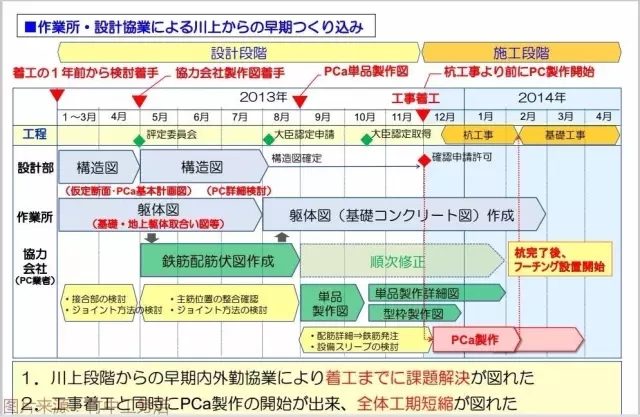 PCa预制工法对设计阶段的要求较高,所有问题必须在设计阶段充分检讨。设计、施工与预制件工厂要对施工过程中的结合部、工法等事项共同确认解决。施工开始的同时,预制构件的生产也开始启动。