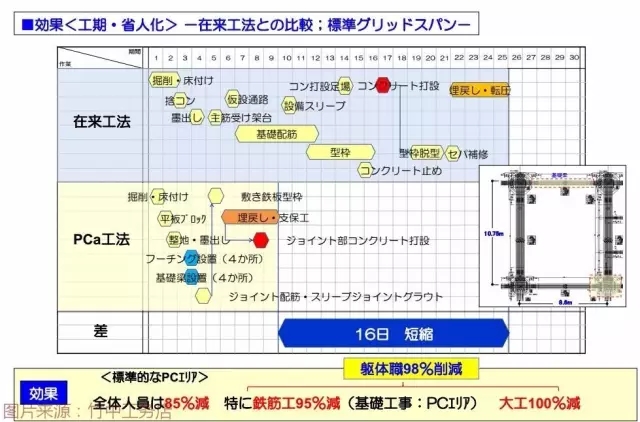 装配式研发 项目竣工之后,竹中工务店将采用预制化的施工方法与传统的一般施工方法进行了对比,发现仅在桩基整备阶段就可以节省16日的工期,全体人员缩减了85%。