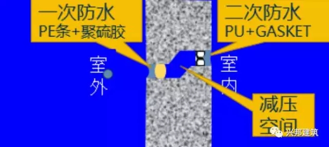 防水板缝介绍:预制板间的板缝用于吸收构件的制作误差和安装误差。这类板缝需采取可靠的防水措施,本工程板缝采用高低坎设计,通过一次材料防水和二次构造防水共同来实现防水效果。板缝处靠材外侧的耐候胶构成第一道防水。靠材内侧留有排水空腔,当耐候胶老化渗水时,将渗水有组织排出外墙。形成构造和材料相结合的防排水体系。