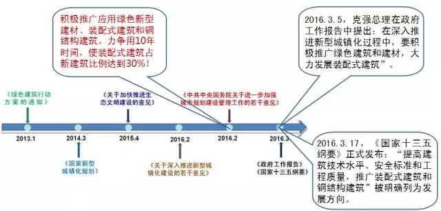 党的十八大提出发展“新型工业化、信息化、城镇化、农业现代化”以来,国家多次提出发展装配式建筑的政策要求,北京、上海、深圳等多个省市发布了具体实施意见。