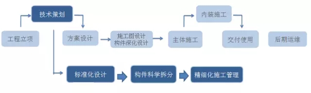 从项目前期策划阶段:产业链上的设计、构件生产和施工总包单位同时开始介入,通过设计优化,提高部品生产效率,通过专业化施工工艺和产业化施工队伍,提高产品品质和质量,提供建造全过程的技术策划与咨询服务。