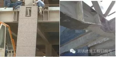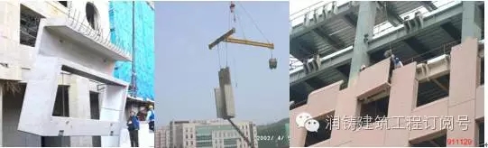 预制混凝土外墙板的主要特点:在工厂采用模具进行单元制作,在现场借助起重设备,安装于主结构外围框架上,混凝土预制外围护墙板,可待主体框架形成后再安装就位。图6为外墙板安装时图片,墙板形状各异,制作安装均可实施。