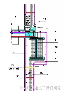 1钢梁 2 墙板内叶 3 墙板外叶 4 保温板材 5 KT板 6 现浇层 10 保温材料 11 栓钉12 玻璃钢连接件 13 钢筋连接件 14 墙内墙板接合铁件 15 梁上墙板接合铁件