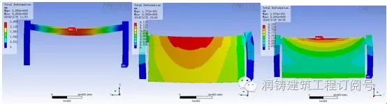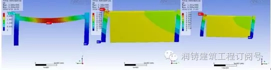 图23位移云图显示,竖向荷载单独作用下,纯梁柱框架竖向位移最大2.66mm(100%),其次是夹芯墙梁墙一体框架位移0.57mm(9.7%),最小是单层墙板钢梁墙一体框架位移0.13mm(5%)。说明墙体抗弯刚度贡献非常大。
