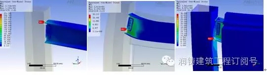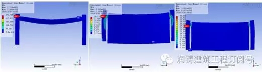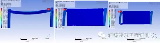 图24整体内应力云图显示,竖向荷载作用下,纯梁柱框架构件钢梁梁端应力最大为271.76MPa(100%),单层墙板钢梁墙一体框架梁端应力20.13MPa,为纯梁柱框架柱的7.4%,夹芯墙梁墙一体框架梁端应力35Mpa,为纯梁柱框架柱的12.0%。