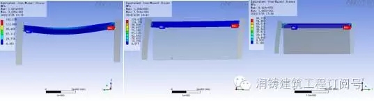 图27梁内应力云图显示,竖向荷载作用下,纯梁柱框架构件钢梁应力最大为271.71MPa(100%),单层墙板钢梁墙一体框架钢梁应力16.66MPa,为纯梁柱框架柱的6.1%,夹芯墙梁墙一体框架钢梁应力20.27Mpa,为纯梁柱框架柱的7.5%。