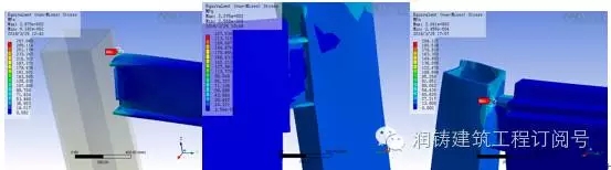 图17内应力云图显示,水平作用与竖向荷载共同作用下,纯梁柱框架构件钢梁梁端应力最大为287MPa(100%),其次是单层墙板钢梁墙一体框架227MPa,为纯梁柱框架柱的79.1%,最小是夹芯墙梁墙一体框架204Mpa,为纯梁柱框架柱的71.0%。