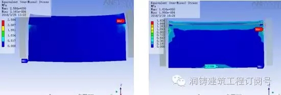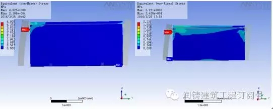 由于同厚度的夹芯墙刚度比单层墙刚度小,分配的内力小,图21钢梁与夹芯墙一体框架中的墙板应力小。