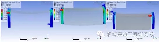 图16位移云图显示,水平作用与竖向荷载共同作用下,纯梁柱框架柱侧移最大,为1.37mm(100%),其次是夹芯墙梁墙一体框架1.22mm, 为纯梁柱框架柱的89.1%,最小是单层墙板钢梁墙一体框架为1.18mm,为纯梁柱框架柱的86.1%。纯梁柱框架抗侧移刚度最小,单层墙板比夹芯墙刚度大,说明墙体刚度有一定贡献。因墙体上侧边与梁连接,另三边自由,墙体呈侧向滑动移动。