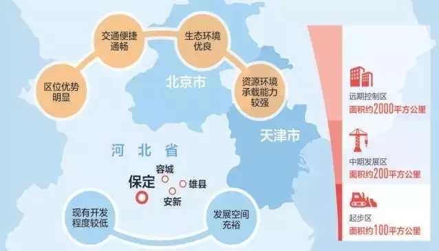 雄安新区规划范围涉及河北省雄县、容城、安新3县及周边部分区域,地处京津保腹地,雄安新区规划建设以特定区域为起步区先行开发,起步区面积约100平方公里,中期发展区面积约200平方公里,远期控制区面积约2000平方公里。