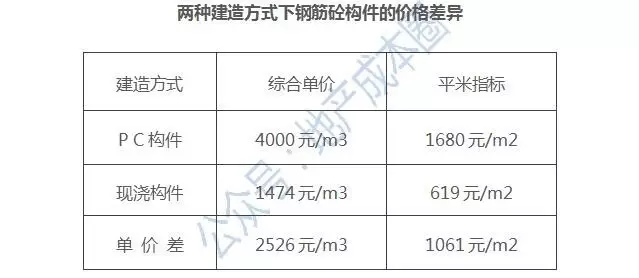 综合上述价格,就可以得到各种构件的单价差,从而结合具体项目的各构件特征就可以计算得到整体的生产方式差价。如下表: