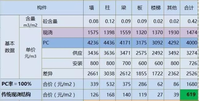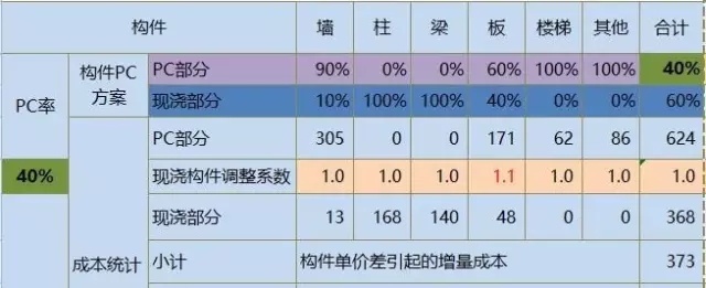 结合PC率的设计方案,比如选择哪些构件做PC、做多少比例的PC,就可以大致得到因砼构件单价差所导致的增量成本。