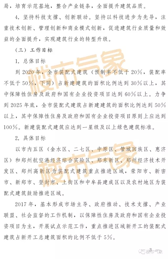 2月23日,《郑州市人民政府关于大力推进装配式建筑发展的实施意见》在市政府网站公布。《实施意见》提出,到2020年,全市装配式建筑(预制率不低于20%,装配率不低于50%,下同)占新建建筑的面积比例达到30%以上,其中保障性住房及政府和国有企业投资项目达到60%以上。力争到2025年底,全市装配式建筑占新建建筑的面积比例达到50%以上,其中保障性住房及政府和国有企业投资项目原则上应达到100%。新建装配式建筑应达到一星级及以上绿色建筑标准。