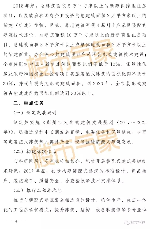 为此,《实施意见》提出,要制定并实施《郑州市装配式建筑发展规划(2017~2025年)》;2017年底,初步构建装配式建筑技术支撑体系;推行工程总承包;推进建筑全装修,倡导菜单式全装修,满足消费者个性化需求;创新监管体系;以保障性住房及政府和国有企业投资项目为切入点,开展装配式建筑项目试点示范等。