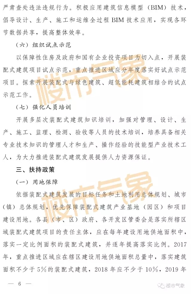 此外,《实施意见》从用地保障、财政支持、金融支持、税费优惠等方面对装配式建筑发展进行扶持。各县(市、区)政府、各开发区管委会是落实所辖区域装配式建筑项目的责任主体,应在每年建设用地供地面积中,落实一定比例面积的装配式建筑,并逐年提高落实比例。2017年,重点推进区域应在辖区建设用地供地面积总量中,落实建筑面积不少于5%的装配式建筑,2018年应不少于10%,2019年应不少于20%,到2020年,落实比例应达到30%以上。