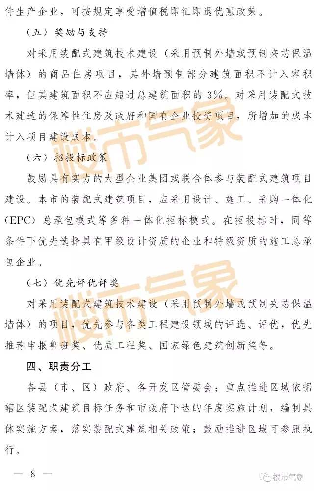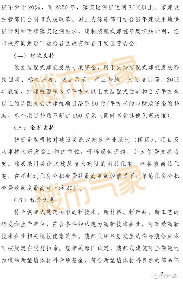 财政支持方面,2018年底前,对建筑面积3万平方米以上的装配式住宅和2万平方米以上的装配式公共建筑项目给予50元/平方米的市财政资金的补助,单个项目补贴不超过500万元(同时享受其他优惠政策)。