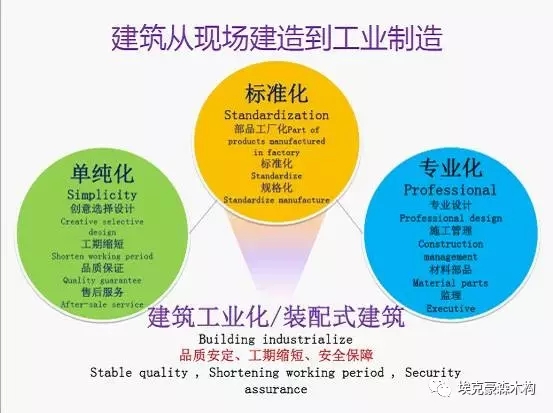 建筑工业从现场施工到工业化制造的趋势:单纯化、标准化和专业化的要求,品质稳定、工期缩短,保障安全的优点。