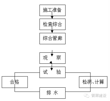 5)闭水试验是对箱涵施工和材料质量进行全面的检验,如出现此渗水现象,应先在渗漏处一一做好记号,在排干综合管廊内水后进行认真处理。处理后再做试验,如此重复进行直至闭水合格为止。