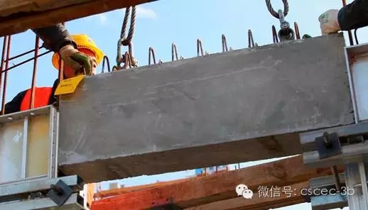 8、墙板安装结束后,再吊装叠合梁、叠合板,叠合梁会嵌入到事先支设好的铝模中,叠合板再与梁通过钢筋接头进行连接。