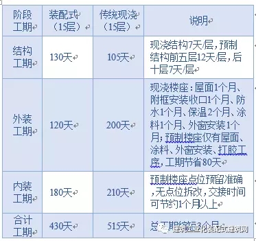 装配式建造方式相比传统现浇建造方式,在墙钢筋绑扎、墙模板安装、墙混凝土浇筑、墙模板拆除、水平模板支设、板混凝土浇筑等工序上时间有所缩短,但新增的预制墙板吊装、灌浆作业及叠合板吊装增加了工期。总体来看,结构总工期相差不大。但实施全装修的装配式建筑,由于可以提前室内装修作业进场时间、缩短外墙装饰作业时间、提前室外工程开始时间,可以大大缩短总工期。按照万科部分项目的经验,以15层楼为例,宏观工期可缩短3个月左右,具体如表7所示。