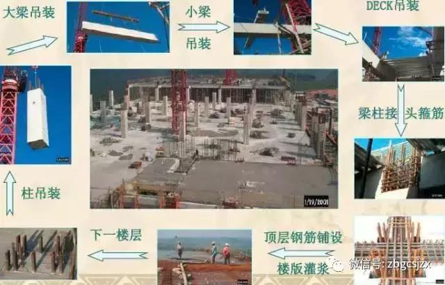 以预制框架结构为例,一层施工完毕后,先吊装上一装配式研发层柱子,接着上主梁、次梁、楼板。预制构件吊装统统结束后,就开始绑扎连接部位钢筋,最后进行节点和梁板现浇层的浇筑。