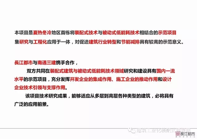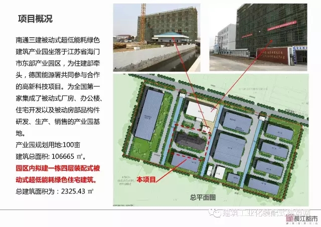 南通三建被动式超低能耗绿色建筑产业园为住建部牵头,德国能源署共同参与合作的高新科技顷目。为全国第一家集成被动式厂房、办公楼、住宅开发以及被动房部品构件研发、生产、销售的产业园基地。本项目是夏热冬冷地区首栋将装配式技术与被动式低能耗技术相结合的示范项目。该项目集研究与工程化应用于一体,对促进建筑行业转型和节能减排具有较高的示范意义。