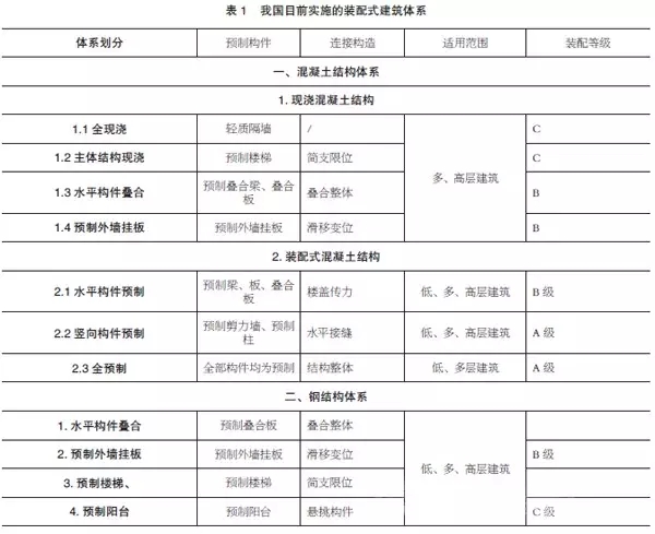 我国目前实施的装配式建筑体系包括混凝土结构体系和钢结构体系两大类,详见表1。