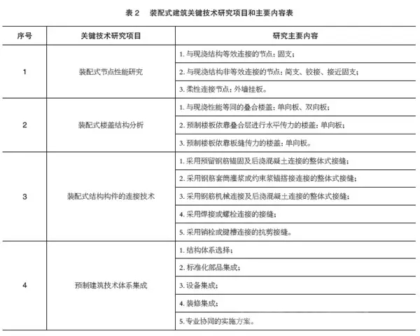 装配式建筑关键技术研究仍然是未来需要聚焦开展的工作层面,以为我国建筑产业化的深入、持续和广泛推进提供强大的技术支撑和保障,表2是关于装配式建筑关键技术研究的项目和主要内容要点,这些研究成果及形成的有关技术标准能极大丰富我国装配式建筑技术标准体系。